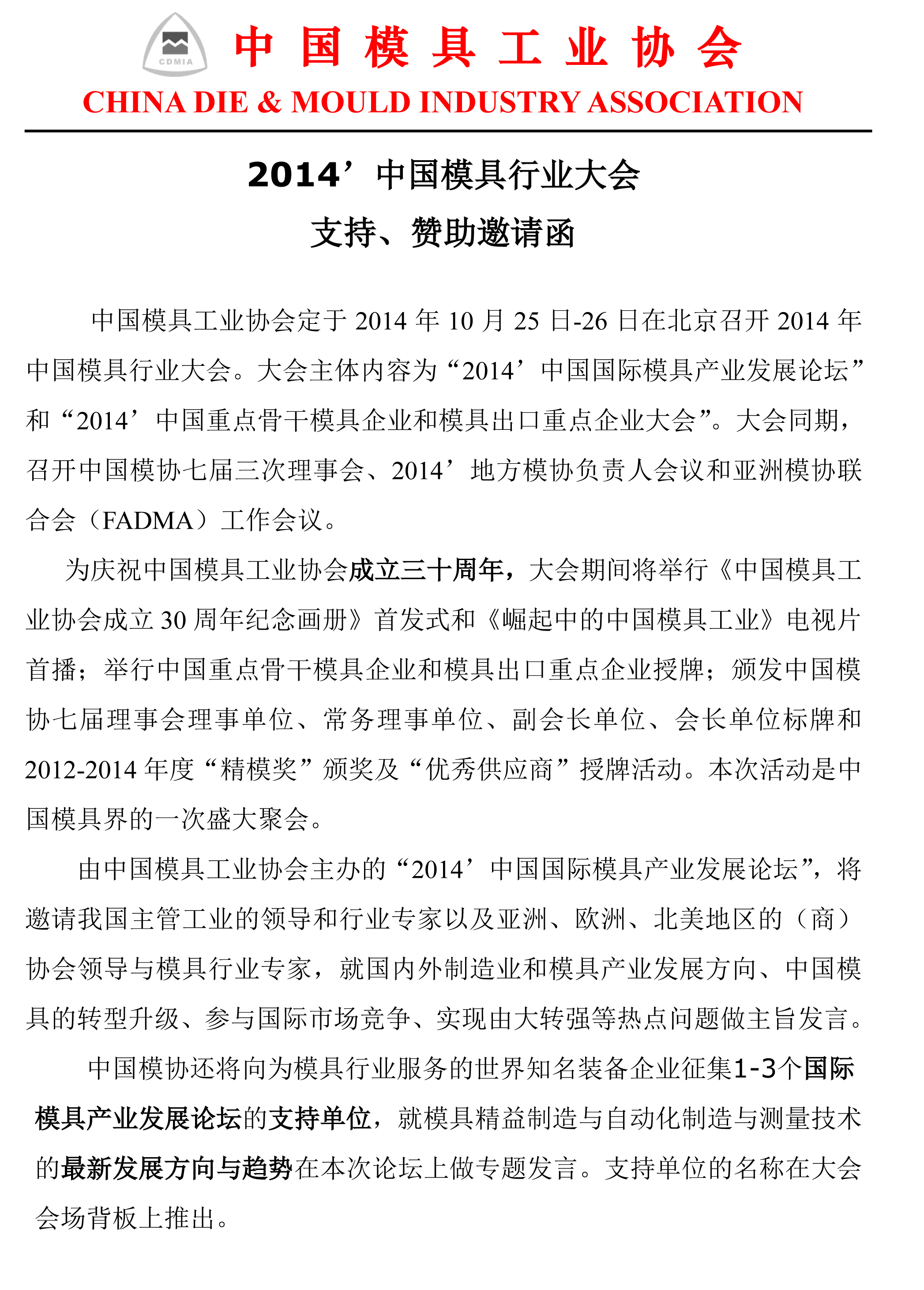 2014’中國模具行業大會支持、贊助邀請函