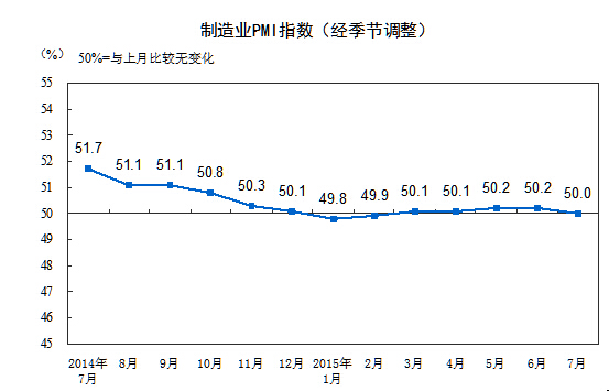 2015年7月份,中國制造業采購經理指數(PMI)為50.0%,比上月回落0.2個百分點,位于臨界點。