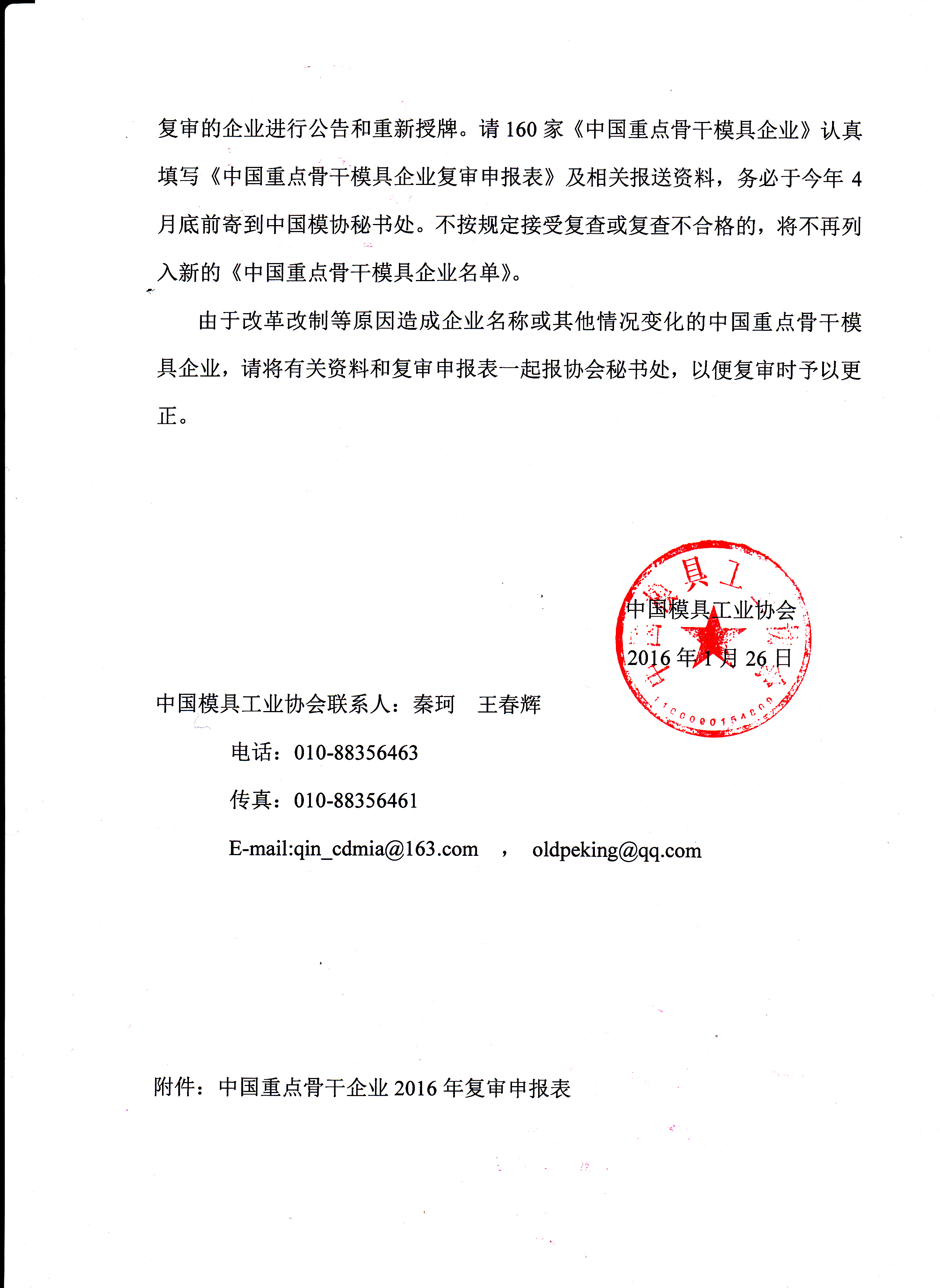 關(guān)于開展2016年“中國(guó)重點(diǎn)骨干模具企業(yè)”復(fù)審工作的通知