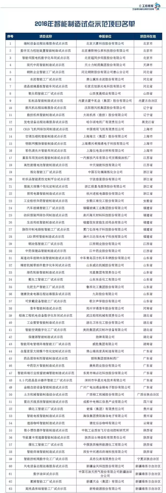關于公布2016年智能制造試點示范項目名單的通告