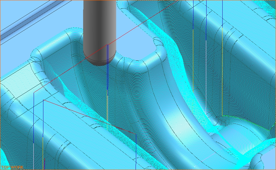 為提高加工效率及保證刀具強度,粗加工時選擇的刀具直徑較大,導致精加工時加工余量不均勻,為了保證加工后產品的表面質量,精加工時采用的程序應充分考慮刀片的磨損及刀片自身的耐沖擊性,盡量保證清根時余量均勻。進行了數控精加工程序參數設計及數控精加工程序刀路設計。示意圖見圖片(四)。