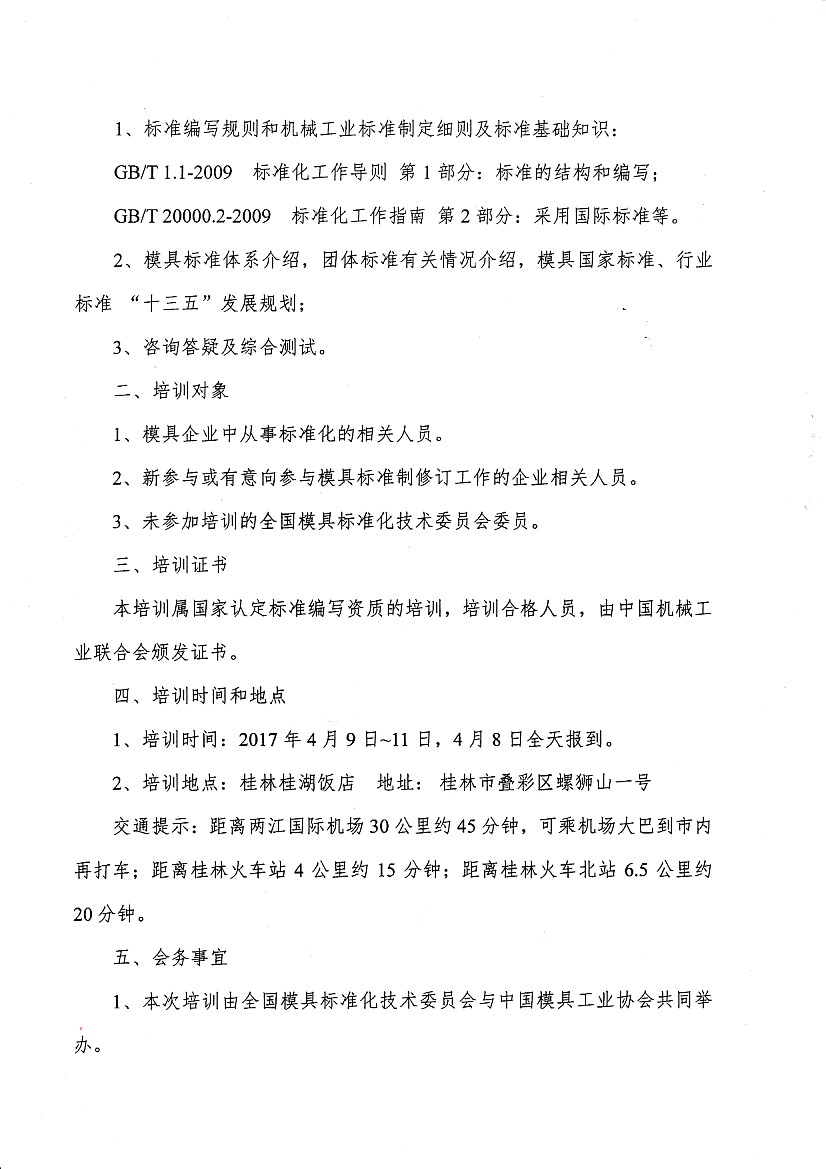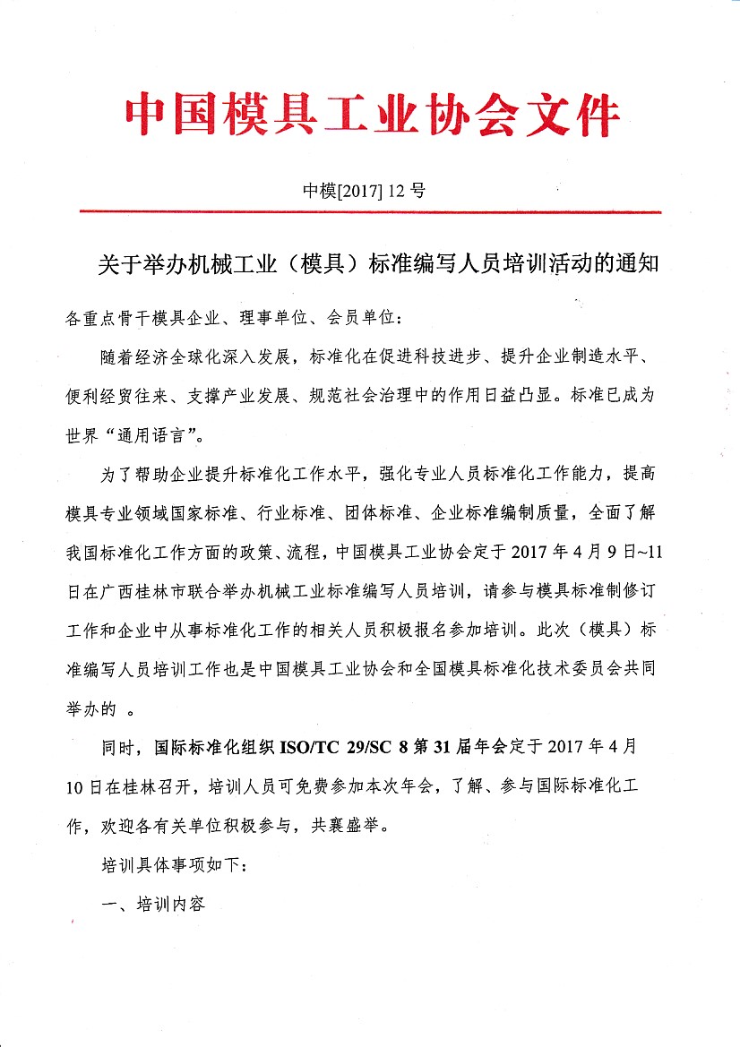 關(guān)于舉辦機械工業(yè)(模具)標(biāo)準(zhǔn)編寫人員培訓(xùn)活動的通知