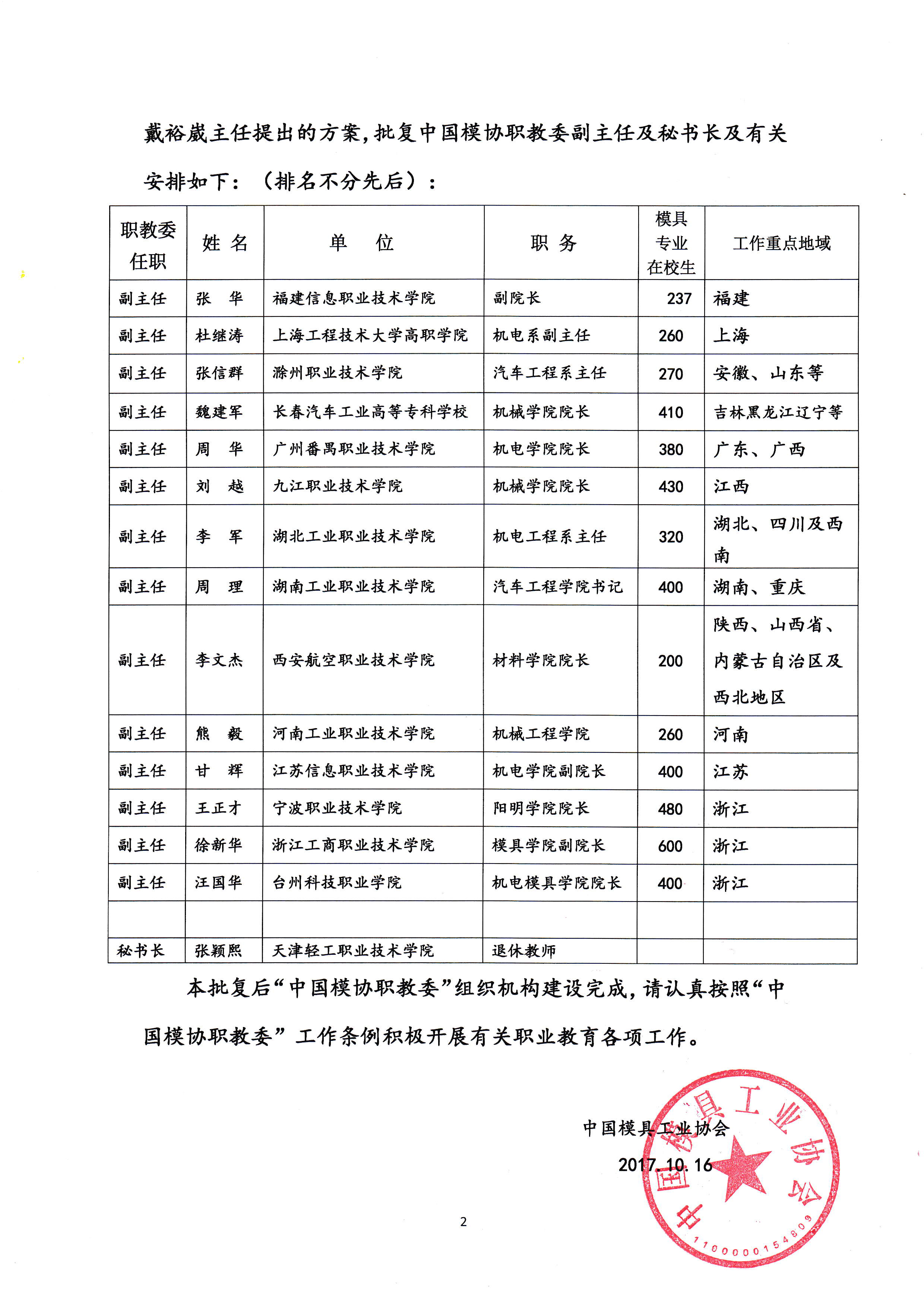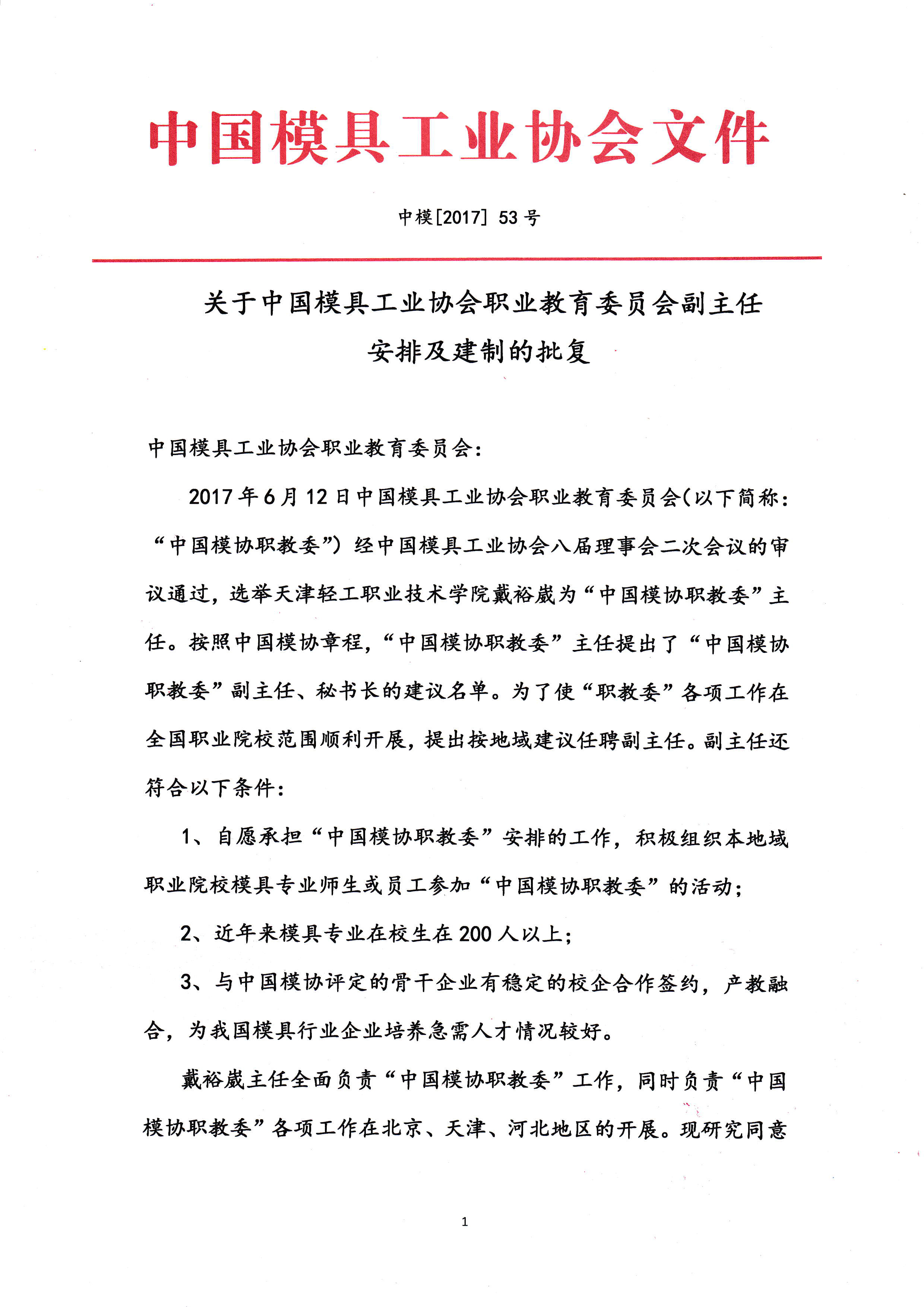 關(guān)于中國模具工業(yè)協(xié)會職業(yè)教育委員會副主任安排及建制的批復(fù)