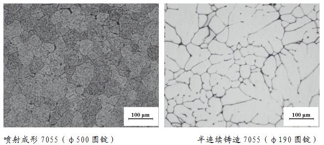 噴射成形技術(shù)可大幅度提升凝固過程中的冷卻速率,采用該技術(shù)制備的合金晶粒為細小等軸晶,微觀組織均勻,無宏觀偏析。噴射成形7055鋁合金與半連續(xù)鑄造7055鋁合金的金相對比見圖2。