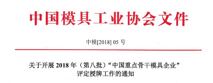 根據會員企業和模具企業的要求,中國模具工業協會決定啟動2018年(第八批)《中國重點骨干模具企業》評定授牌工作。此次評定授牌工作仍然堅持“會員自愿申報、有關部門推薦和不向企業收取任何費用”的原則,按照“《中國重點骨干模具企業》評定及授牌工作的實施細則”規定的工作流程進行評定授牌,即:企業申報、專家評審(必要時請申報企業提供補充資料或派人進行實地考察)、評定授牌工作領導小組審核批準,在中國模協理事會上授牌。