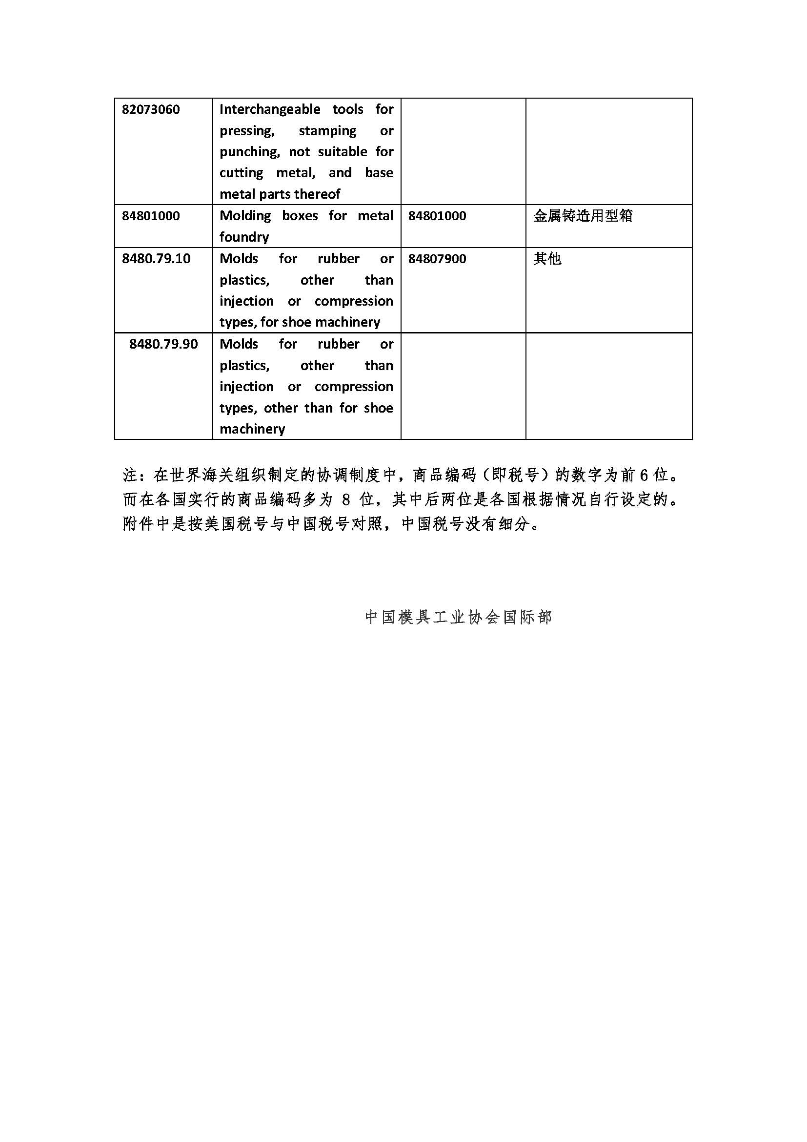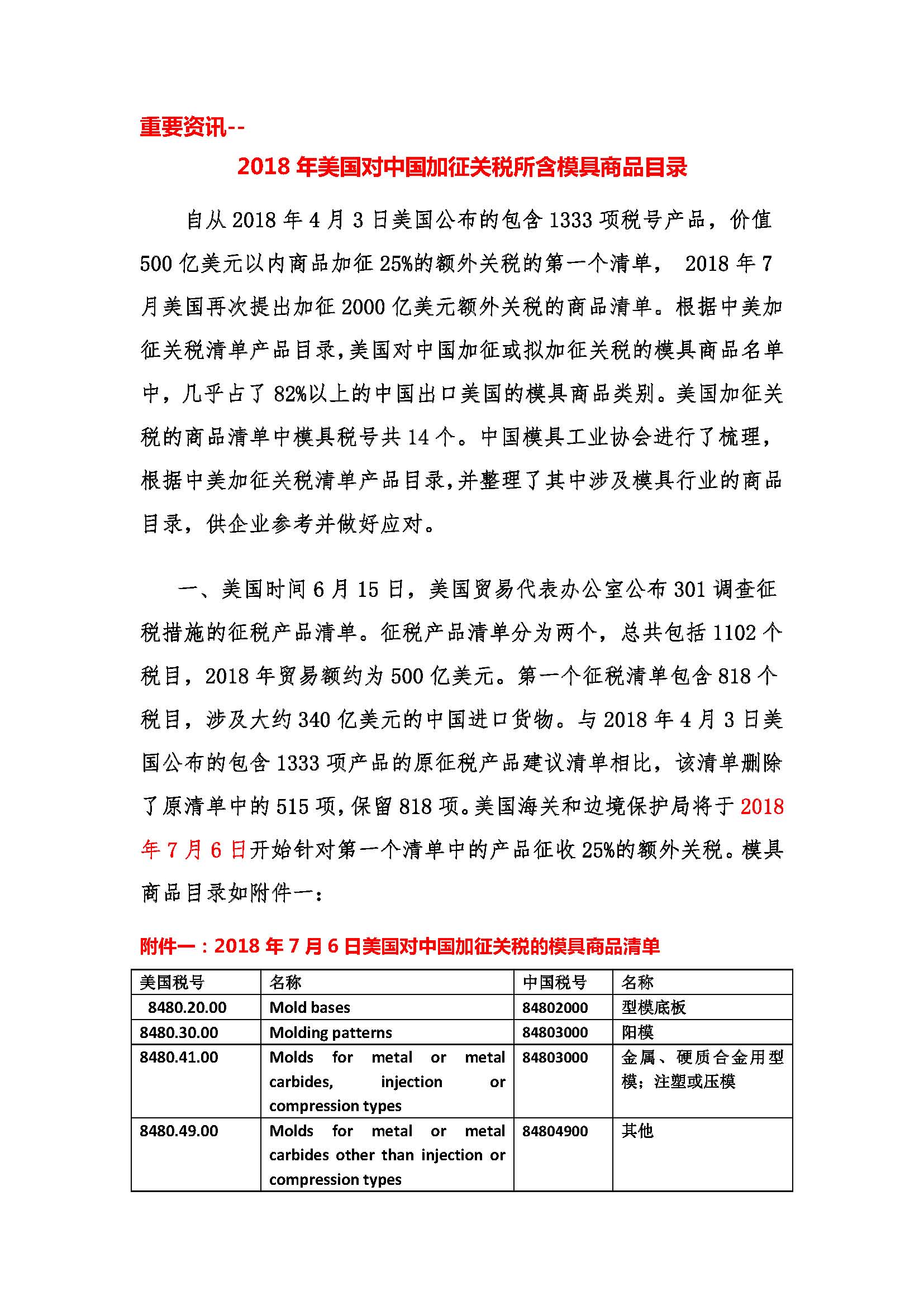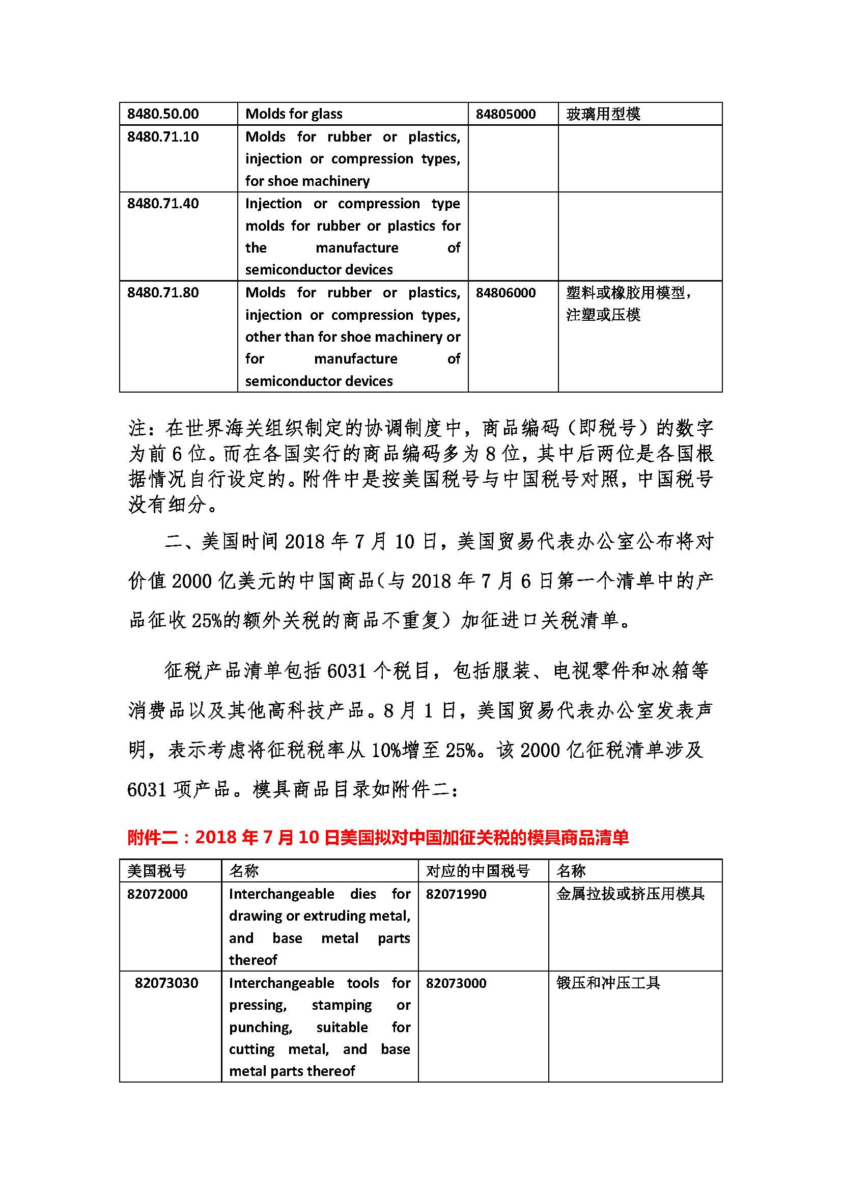 2018年美國對中國加征關稅所含模具商品目錄