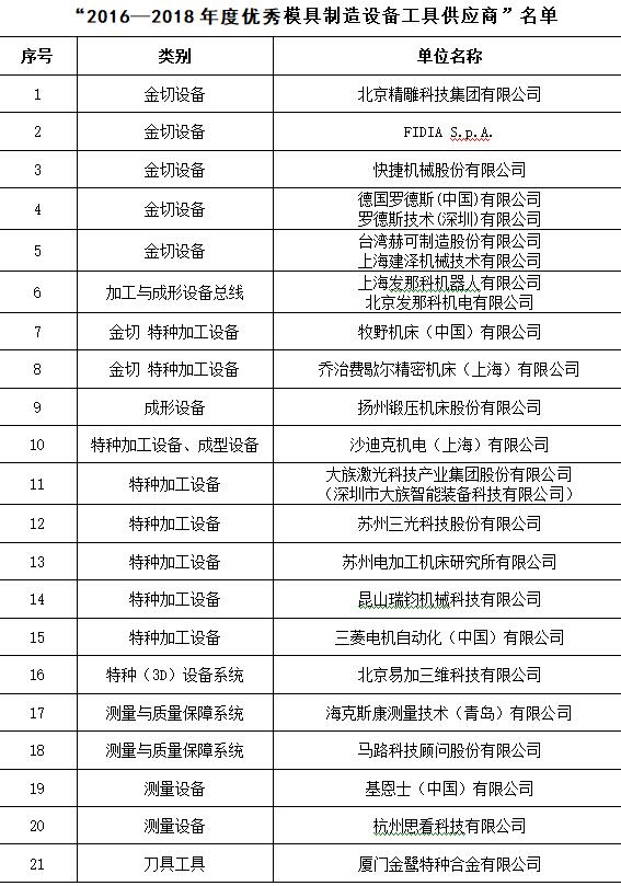 在知名品牌專業(yè)展會(huì)——中國國際模具技術(shù)和設(shè)備展覽會(huì)DMC上開展優(yōu)秀供應(yīng)商的評(píng)選活動(dòng),得到了各行業(yè)的廣泛認(rèn)可,被評(píng)定為優(yōu)秀供應(yīng)商的企業(yè),將在模具企業(yè)的采購中獲得優(yōu)先推薦資格并在行業(yè)里得到廣泛的宣傳推廣,并在中國模協(xié)的官網(wǎng)上進(jìn)行公告,至今已成定式。DMC2018期間,中國模具工業(yè)協(xié)會(huì)委托中國模協(xié)裝備委員會(huì)、數(shù)字化信息化委員會(huì)、材料委員會(huì),本著自愿的原則,依據(jù)供應(yīng)商的技術(shù)水平、在模具行業(yè)的服務(wù)能力、市場占有率的高低、模具行業(yè)服務(wù)滿意度等行業(yè)貢獻(xiàn)指標(biāo),并結(jié)合模具企業(yè)的意見,最終評(píng)選出21家“2016—2018年度優(yōu)秀模具制造設(shè)備工具供應(yīng)商”、3家“2016—2018年度優(yōu)秀模具設(shè)計(jì)制造管理軟件供應(yīng)商”、16家“2016—2018年度優(yōu)秀模具材料供應(yīng)商”(同時(shí)見m.1718jz.com,diemouldchina.com.cn),具體名單如下所示,排名均不分先后。