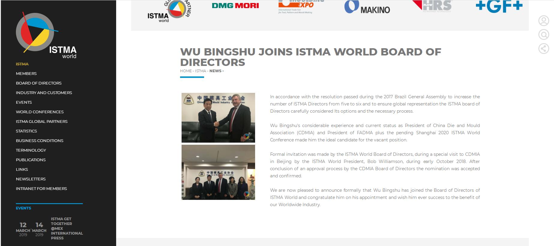 國際專用工裝和加工協(xié)會主席Bob Williamson于2018年 9月18日郵件正式致函中國模具工業(yè)協(xié)會,經他提名中國模具工業(yè)協(xié)會會長武兵書先生擔任國際模協(xié)ISTMA董事(ISTMA World Director)。