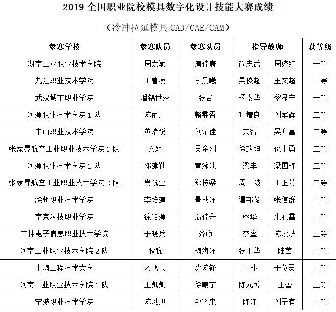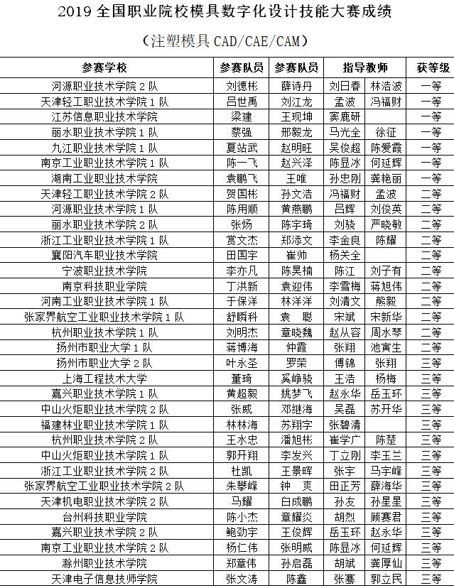 2019全國職業(yè)院校模具數(shù)字化設計技能大賽成績