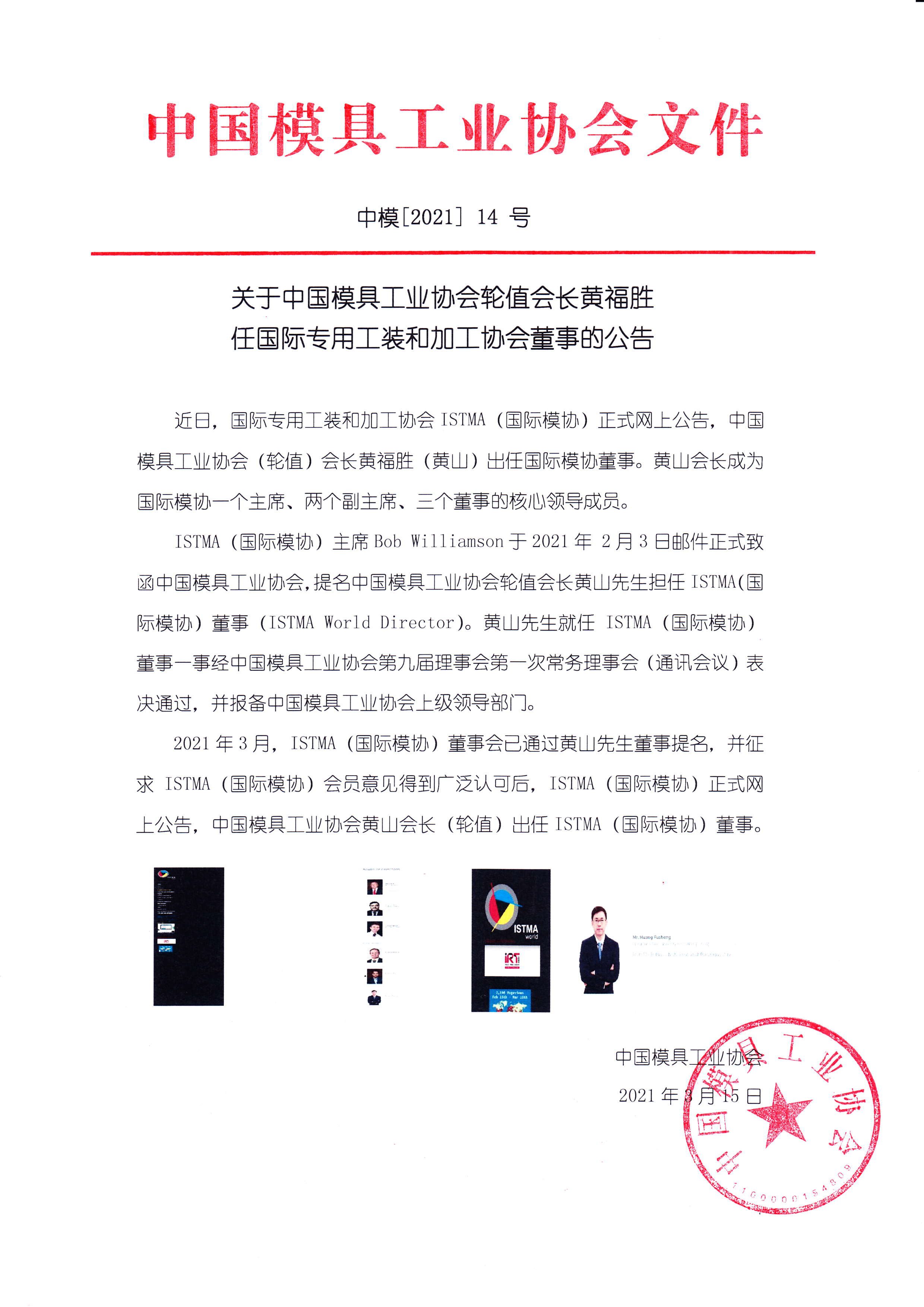 關(guān)于中國模具工業(yè)協(xié)會輪值會長黃福勝任國際專用工裝和加工協(xié)會董事的公告