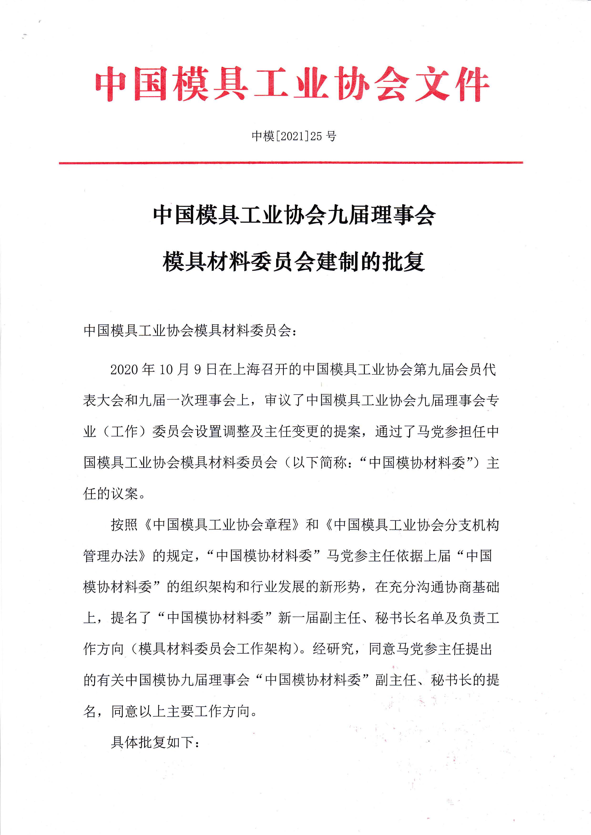 第九屆理事會模具材料委員會建制的批復