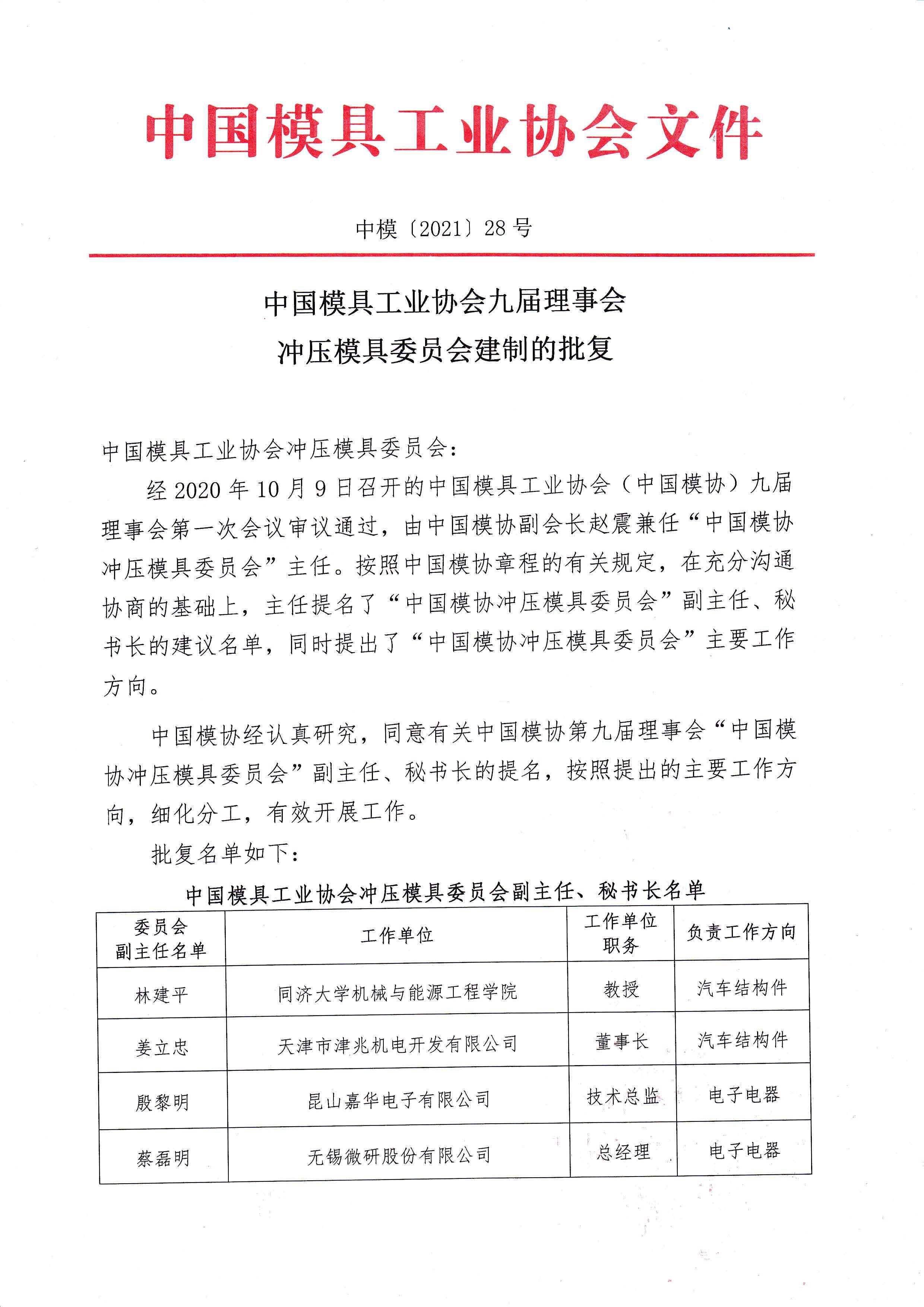 第九屆理事會(huì)沖壓模具委員會(huì)建制的批復(fù)