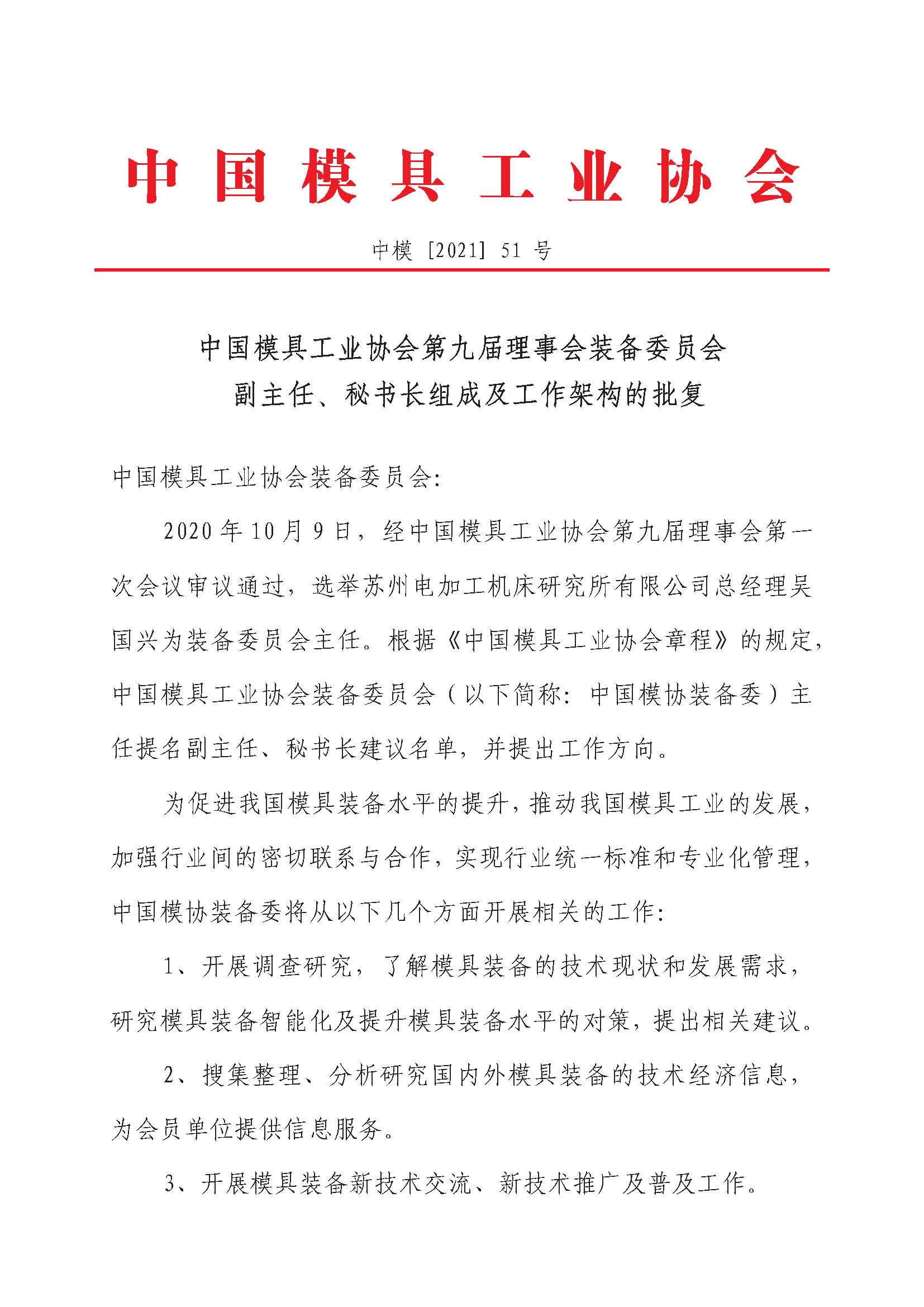 中國模協第九屆理事會裝備委員會副主任、秘書長組成及工作架構的批復