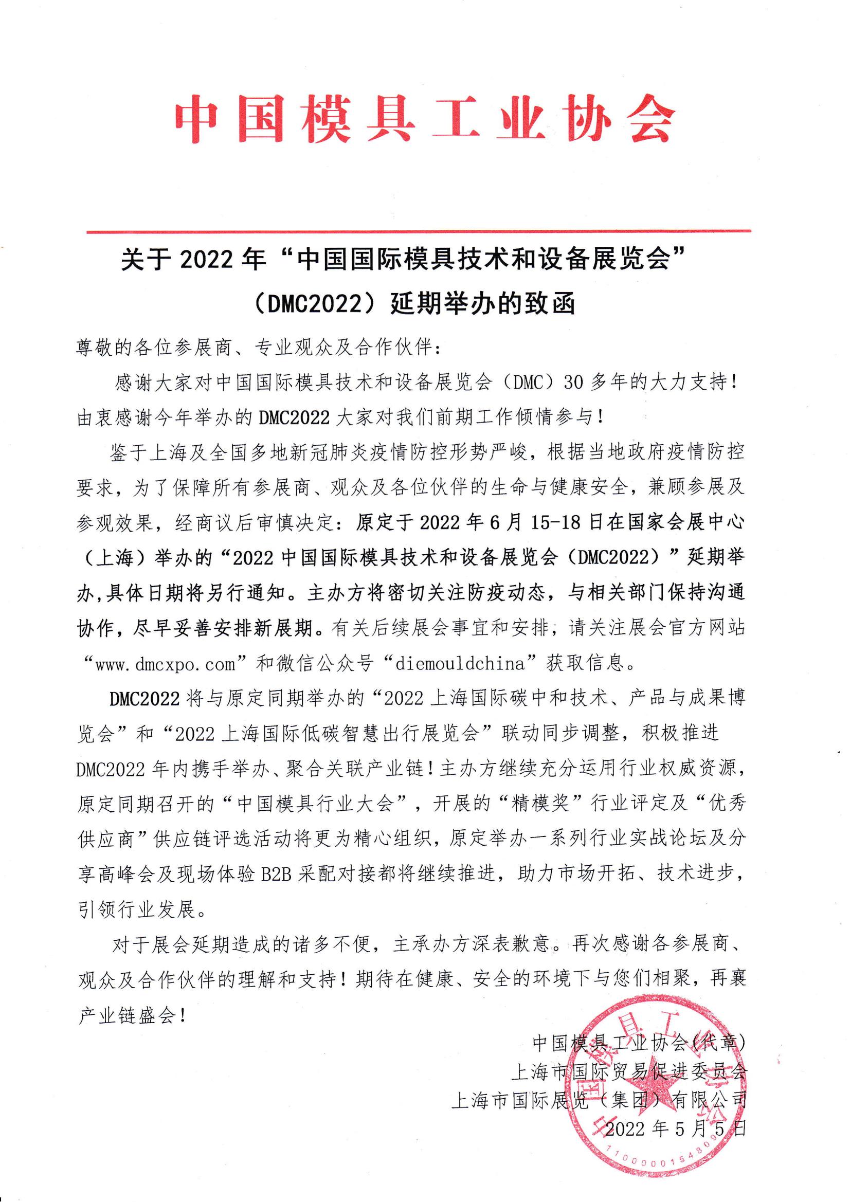 關于2022年“中國國際模具技術和設備展覽會”(DMC2022)延期舉辦的致函