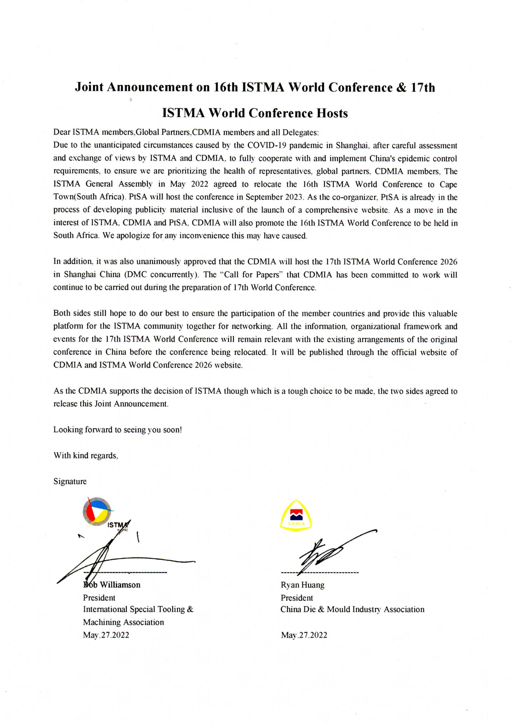 Joint Announcement on 16th ISTMA World Conference& 17th ISTMA World Conference Hosts