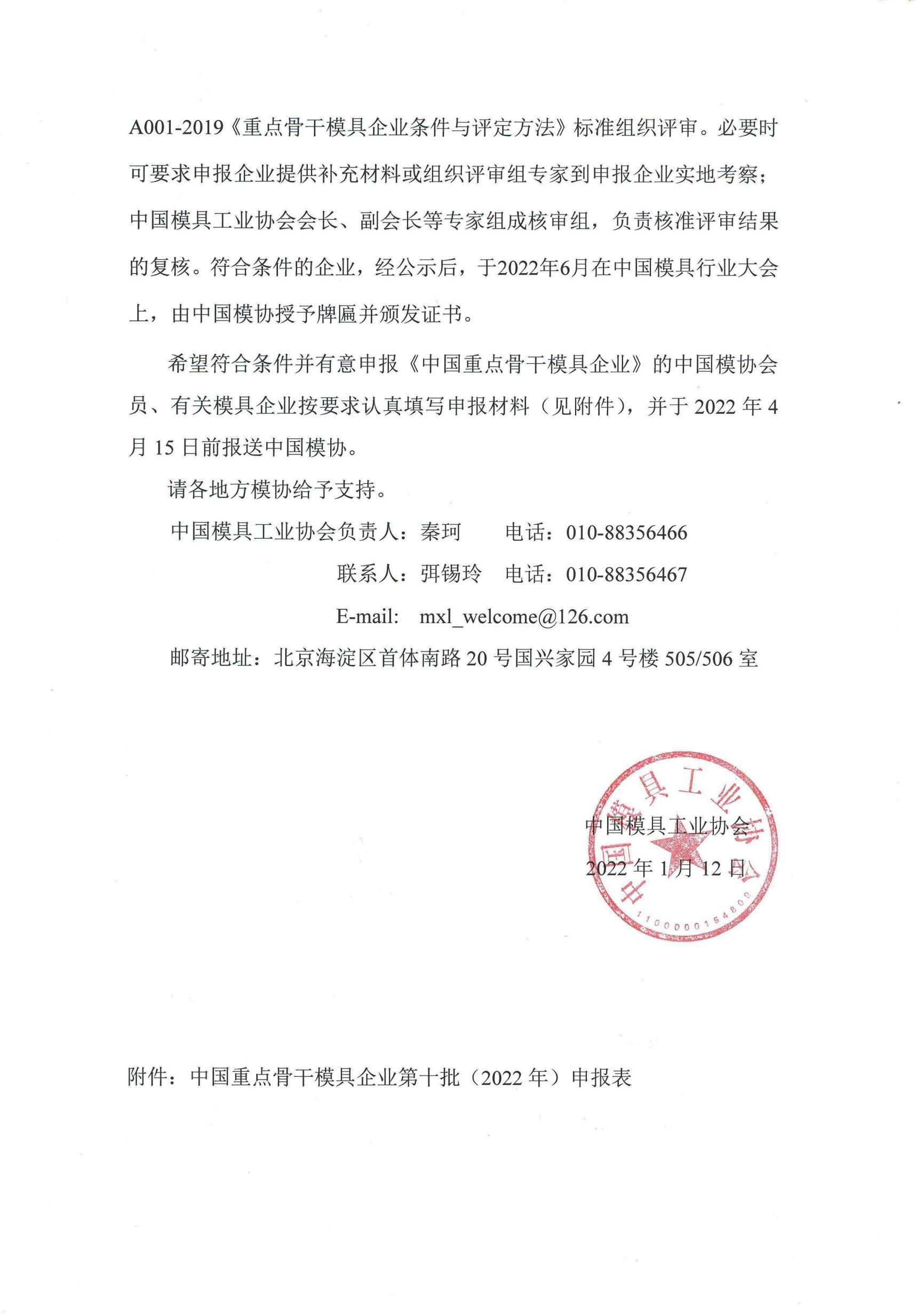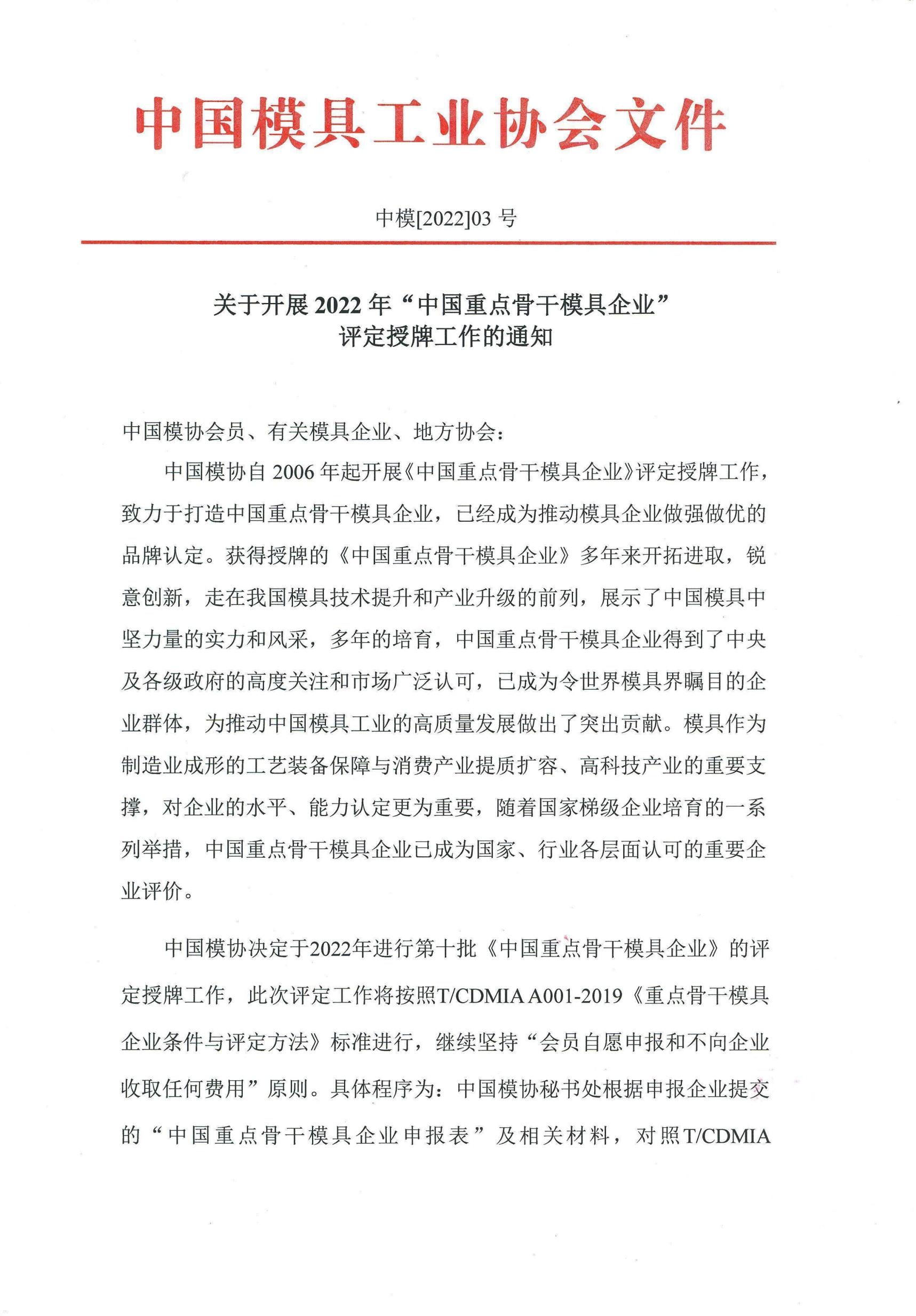 關于開展2022年“中國重點骨干模具企業”評定授牌工作的通知