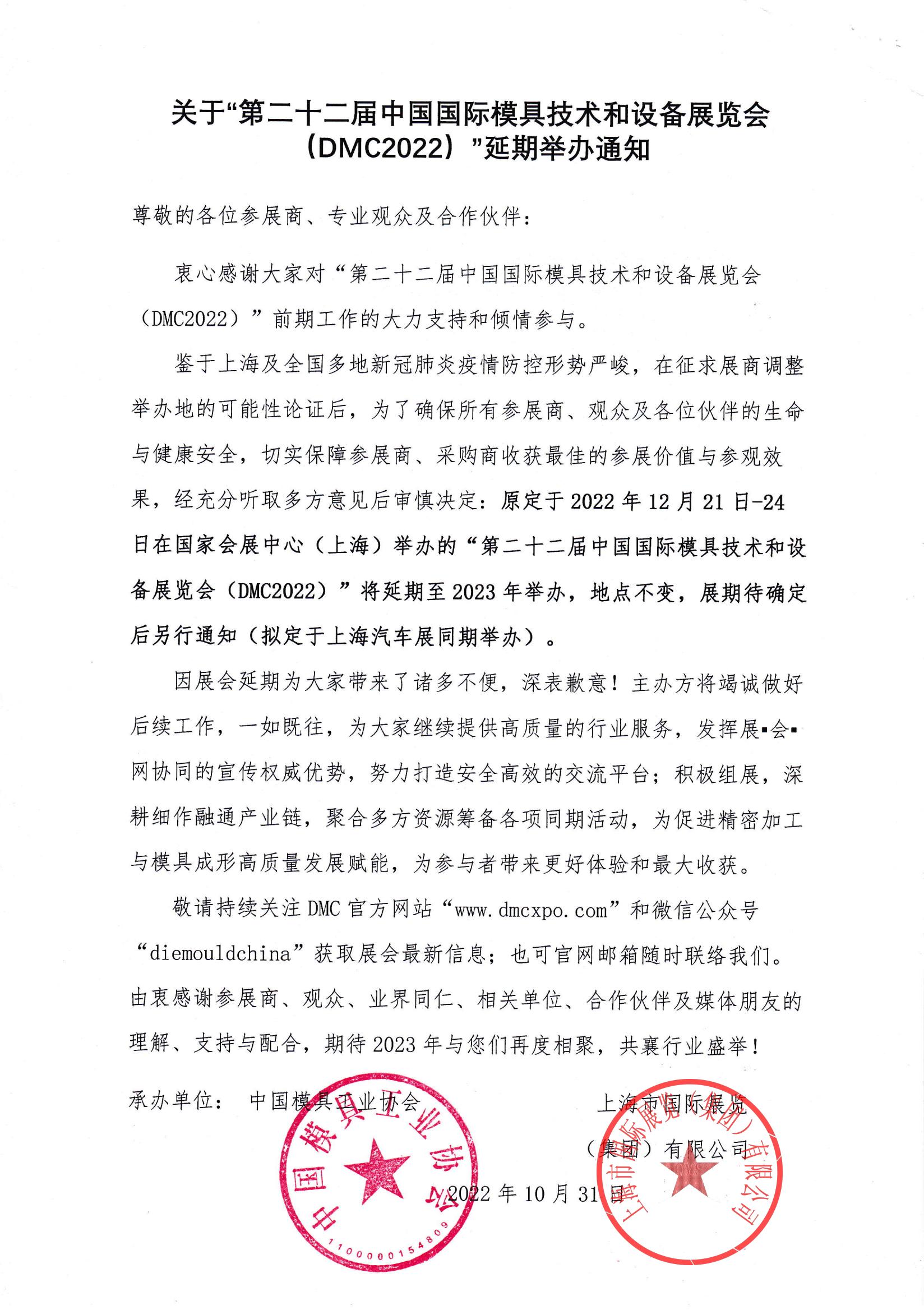 關于“第二十二屆中國國際模具技術和設備展覽會(DMC2022)”延期舉辦的通知