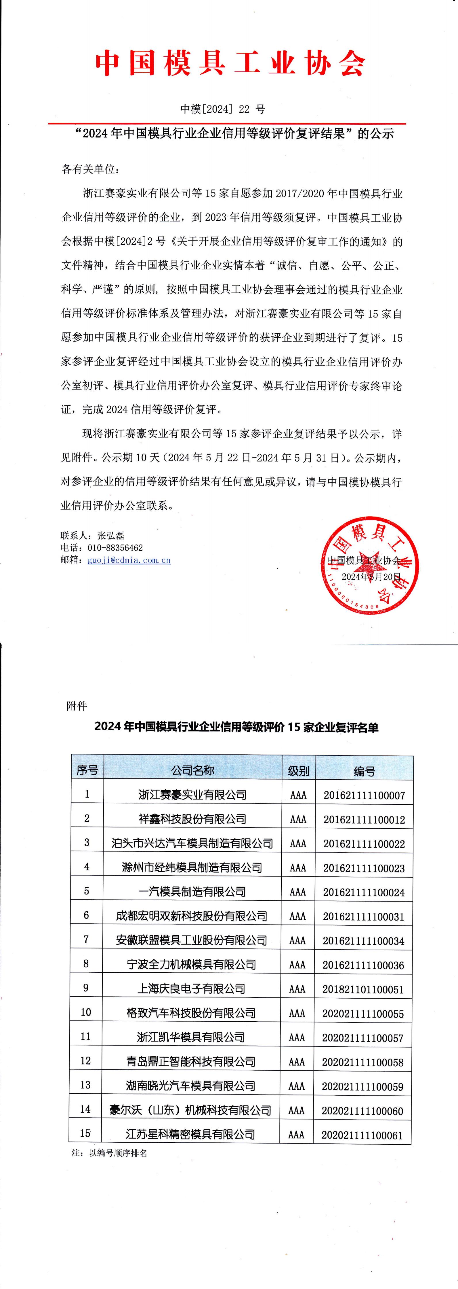 “2024年中國模具行業企業信用等級評價復評結果”的公示