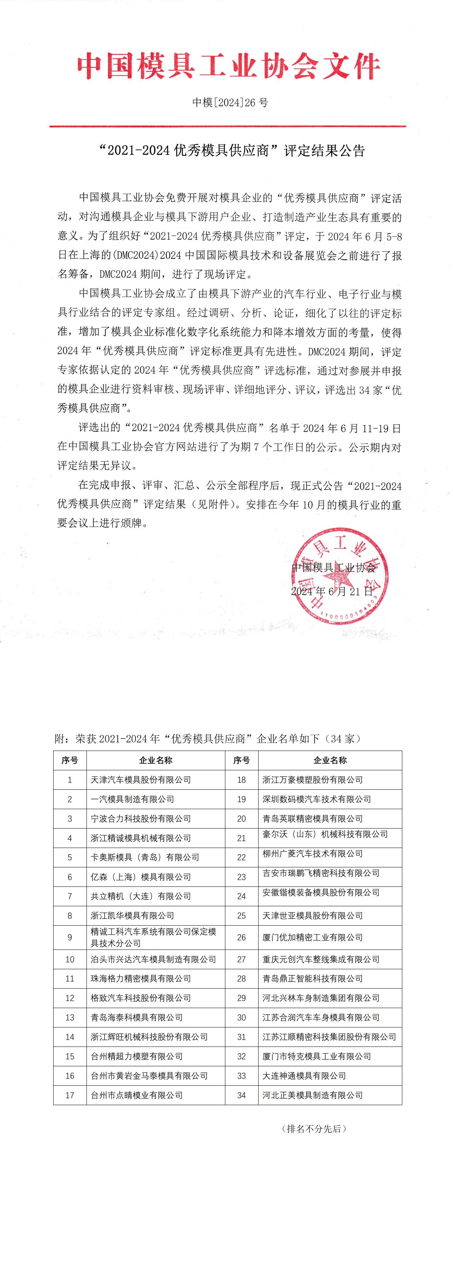 “2021-2024優(yōu)秀模具供應(yīng)商”評定結(jié)果公告