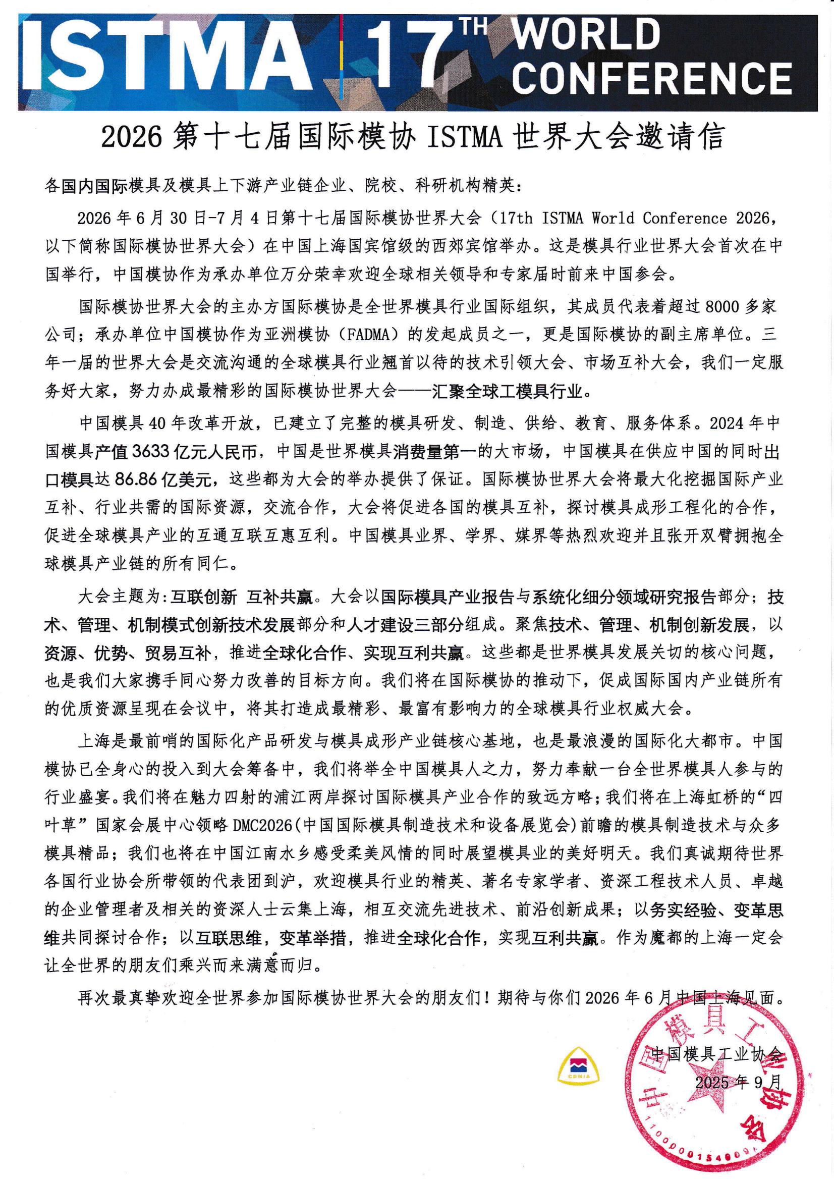 2026第十七屆國際模協ISTMA世界大會邀請信